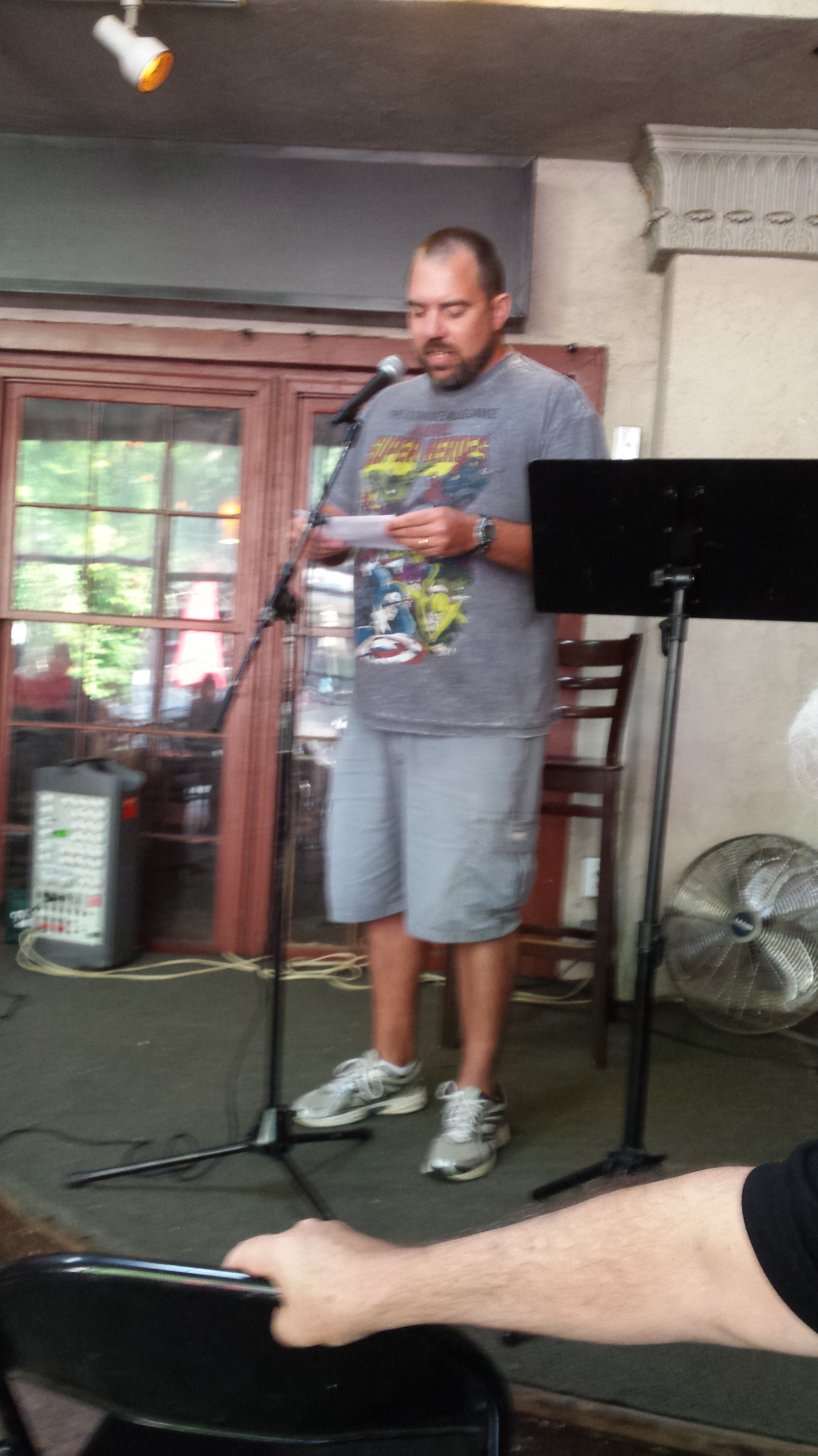 Don’t get me wrong—I truly like listening to my fellow poets—I thought Tammy Foster Brewer’s work was especially good this time—and I know I have her book around here someplace and I really need to re-read it.  Of course I enjoyed Robert Lee Brewer’s work too (I laughed out loud at the “Love Song of Lt. Commander Data”) and also Andrea Jurjević’s poetry—I like to hear them as writers and experience them as readers, which is why I always corral them for the 10 o’clock hour.  I find something new every time I listen to them—and that’s great.  And it’s amazing to listen to so many Atlanta poets just in general.  There’s a wealth of poetry here, and we can all thank Kodac Harrison’s work with the Local Poet’s Stage for bringing it to such a lively audience.